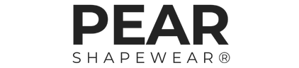 A woman stands barefoot in a studio wearing a black shapewear bodysuit against a light grey background, with the Pear Shapewear logo in the corner.